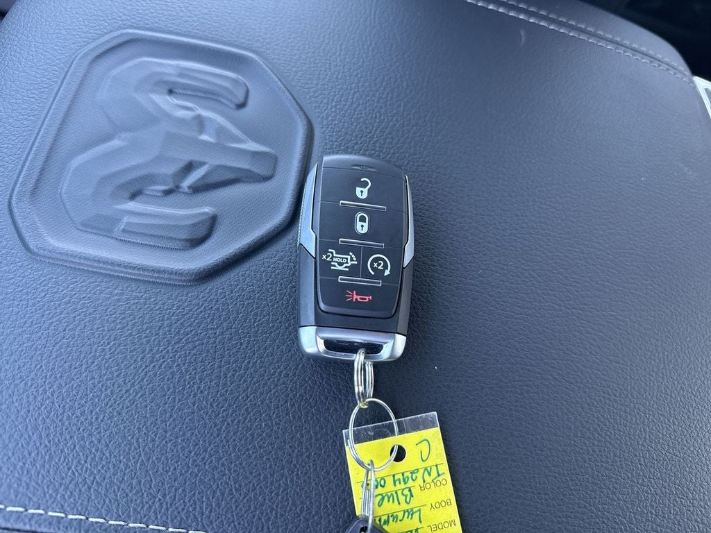 Quick Order Package 21H Laramie. Laramie Level 1 Equipment Group: Remote Tailgate Release; Rain Sensitive Windshield Wipers. Night Edition: Black Headlamp Bezels; Auto Power-Folding Mirrors; 22" X 9" Forged Aluminum Wheels; Exterior Mirrors with Heating Element; Proximity Approach/departure Lamps; Auto Dim Exterior Driver Mirror; Accent Color Door Handles; Black Interior Accents; Body Color Front Bumper; Grille Surround 3 Black Texture 2 Black; Body Color Rear Bumper with Step Pads; RAM Grille Badge - Black; Black Painted Exterior Mirrors Caps; Exterior Mirrors Approach Lamps; Accent Color Premium Power Mirrors; Exterior Mirrors with Supplemental Signals; Sport Performance Hood; Exterior Mirrors Courtesy Lamps; Black Exterior Truck Badging; Accent Color Tailgate Handle; Exterior Mirrors with Memory; Dual Exhaust with Black Tips; Convex Wide-Angle Exterior Mirror Insert; Black Tail Lamp Bezels. Off Road Group: Off Road Decals; Steering Gear Skid Plate; Falken Brand Tires; Raised Ride Height; 285/45R22XL BSW All Terrain Tires; Front Extra Heavy Duty Shock Absorbers; 20" Full Size Aluminum Spare Wheel; Rear Extra Heavy Duty Shock Absorbers; Full Size Spare Tire; Tow Hooks; E-Locker Rear Axle; Transfer Case Skid Plate; Fuel Tank Skid Plate; Selec-Speed Control. 22" X 9" Forged Aluminum Wheels. MOPAR Black Tubular Side Steps. E-Locker Rear Axle. Trailer Brake Control. Hydro Blue Pearlcoat. MOPAR Front and Rear Rubber Floor Mats. 3.92 Rear Axle Ratio. Rear Wheelhouse Liners. **Equipment listed is based on original vehicle build and subject to change. Please confirm the accuracy of the included equipment by calling the dealer prior to purchase.**